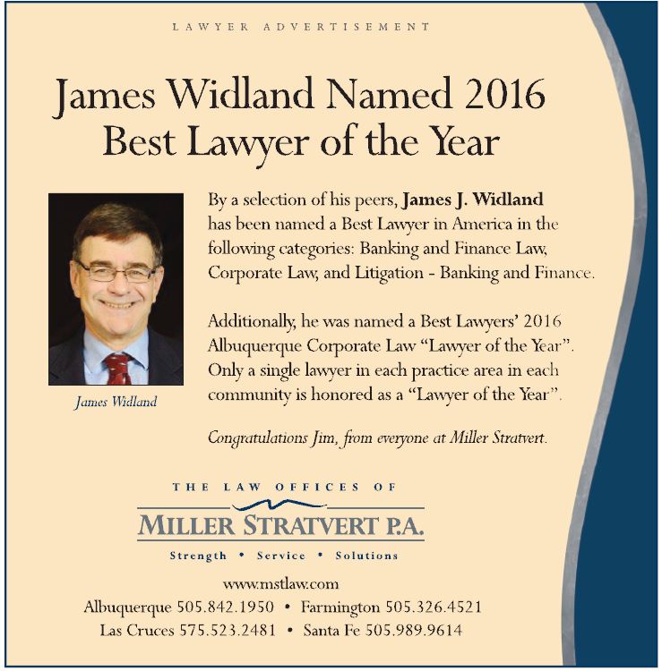 Attorney James J. Widland has been named a Best Lawyer in America in Banking and Finance Law, Corporate Law, and Litigation - Banking and Finance. Additionally, Mr. Widland was named a Best Lawyers' 2016 Albuquerque Corporate Law "Lawyer of the Year". Only a single lawyer in each practice area in each community is honored as a "Lawyer of the Year". Congratulations Jim, from everyone at Miller Stratvert.